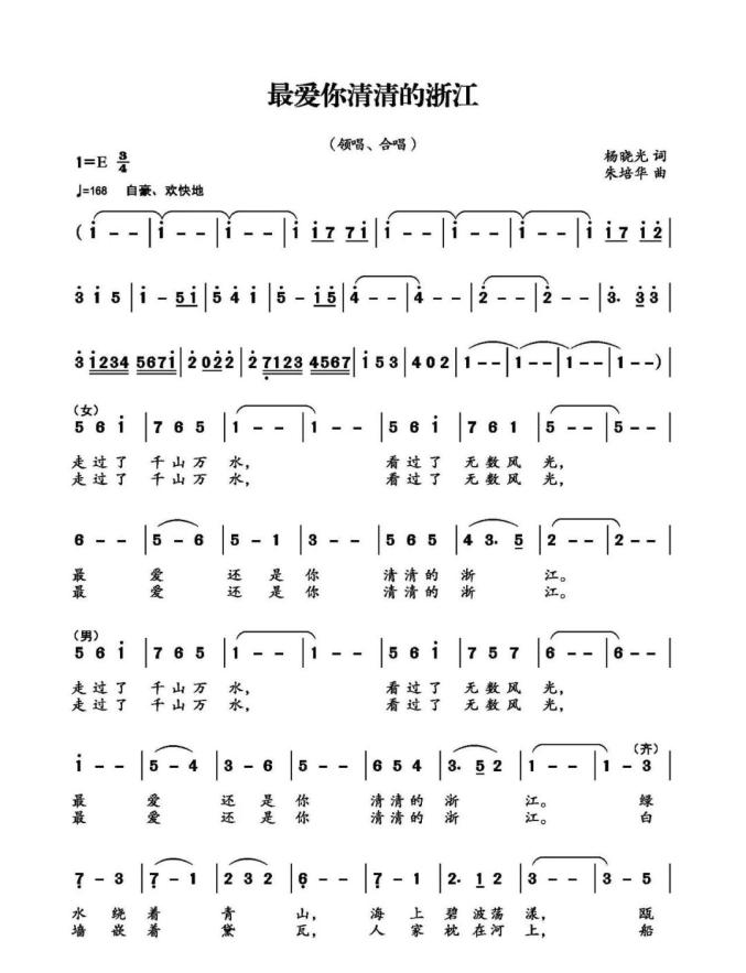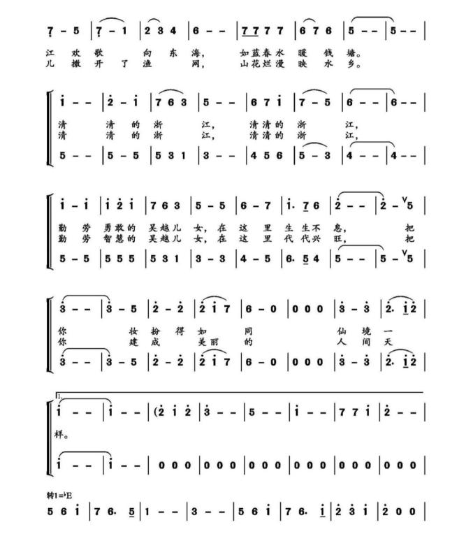 “走过了千山万水,看过了无数风光,最爱还是你清清的浙江”,这首歌用生动传神的笔墨,高度凝炼地勾勒出了浙江山水的自然和人文特点,向人们全景式地展示了浙江水的“清灵”,山的“青秀”和人的“亲切”。歌曲一开篇就饱含深情、直抒胸臆,既写出了世人对浙江的由衷赞美,又表达了浙江儿女对美丽家乡的深深眷恋,唱出了浙江儿女和热爱浙江的人们的心声。