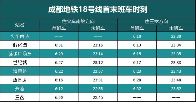 18号线首开段正式开通后,成都轨道交通既有线路首末班车时间不变,18号线首开段首末班车时刻表如下: