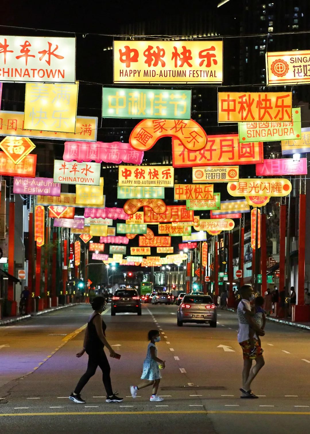 (当地时间2020年9月20日,新加坡民众为庆祝即将到来的中秋节在街头布置的花灯,图片来源@VCG)