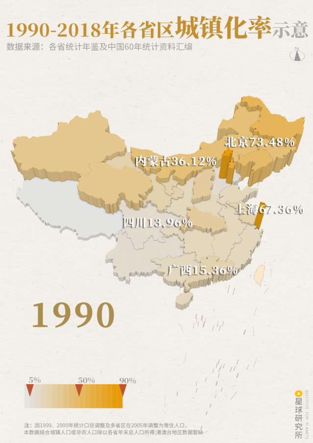 (1990-2018年各省区城镇化率示意,制图@陈志浩/星球研究所)