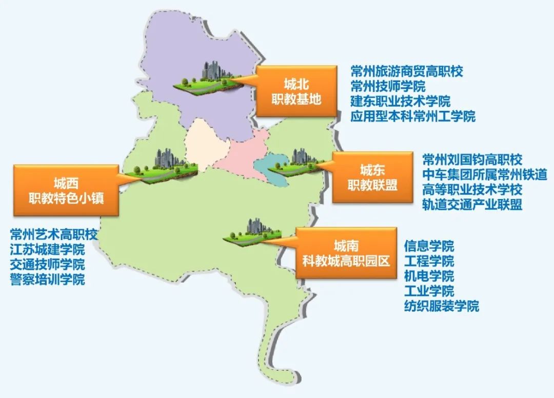 城东建设与轨道交通产业、现代装备制造业相配套的职教联盟,城南深化“经科教联动、产学研结合、校所企共赢”的科教城高职园区建设,城西打造“职教园、新农村、旅游区”深度融合的全国唯一省级职教特色小镇,城北建设以旅游商贸、技师技工、金融服务、高级护理为主的职教基地。