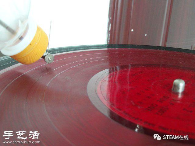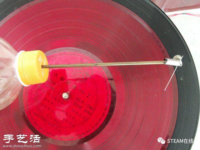 用铁线在饮料瓶尾部穿个小孔并撑起,让唱头能在唱盘上里外平移,这样一台简陋的留声机就DIY完成了,马上试试效果!
