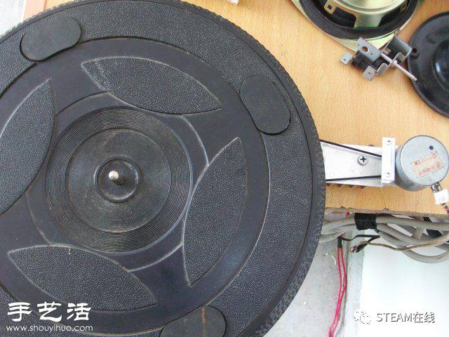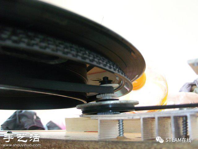 转轮带动圆盘做二次减速,达到唱片要求的转速及匀速。