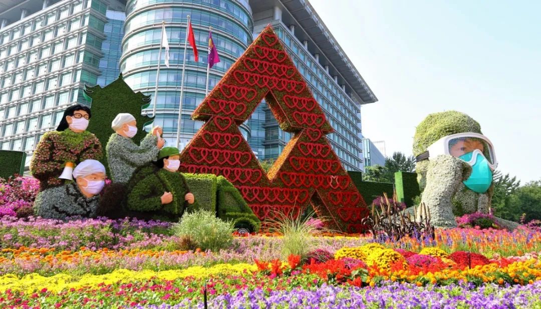 西单西南角花坛以“众志成城”为主题,花坛顶高8米,表现出全国人民众志成城、同心战疫,共建共享健康中国的感人场景。