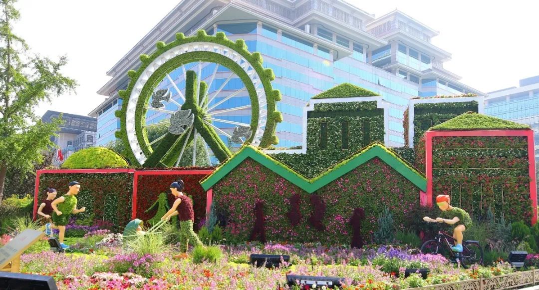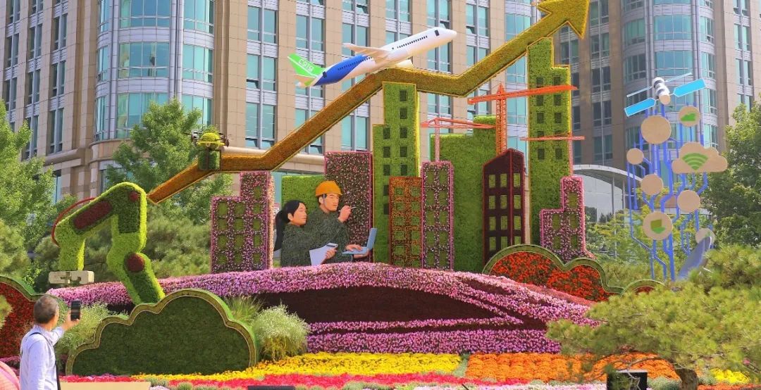 东单东南角打造“高质量发展”主题花坛,花坛顶高9.5米,展示我国高质量发展取得的巨大成就。