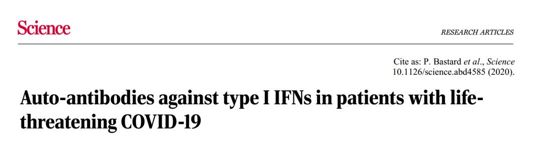 2.Paul Bastard et al. Auto-antibodies against type I IFNs in patients with life-threatening COVID-19. Science, 2020, doi:10.1126/science.abd4585.