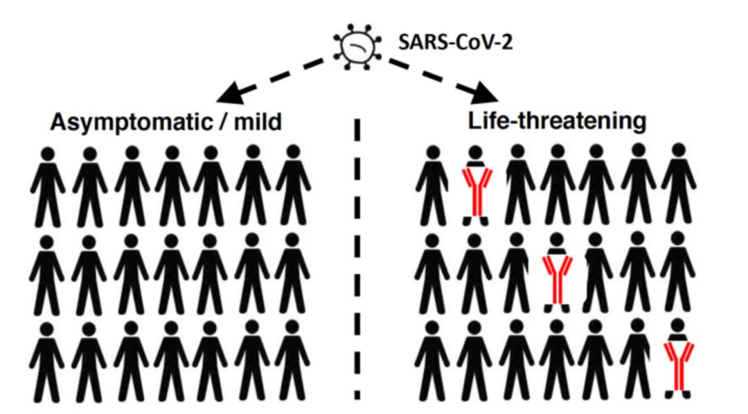 987名重症COVID-19患者中,101人(10.2%)在疾病初期有针对I型干扰素的自身抗体,其中13人有IFN-ω抗体,36人有针对IFN-α的抗体,52人有2种抗体。在663名无症状和轻症SARS-CoV-2感染患者中,研究并没有发现这类自身抗体;而在1227名健康受试者中,4人有针对I型干扰素的自身抗体。