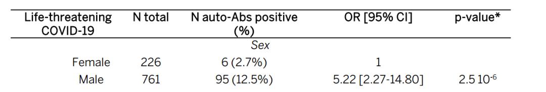 同时,该研究发现这些存在I型IFNs自身抗体的重症COVID-19肺炎患者中,男性患者占绝大部分(95/101,94%)。该比例高于体内不存在I型IFNs自身抗体的重症患者中的男性比例(75%)。这数据提示产生自身中和抗体的致病基因可能与X基因连锁。