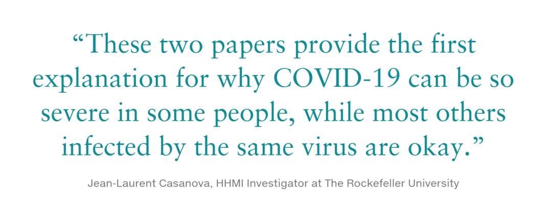 Casanova团队接受采访说“如果没有完整的一套这些抗病毒防御分子,COVID-19患者将无法抵御这种病毒。这个想法激发了一个新主意。也许重症COVID-19患者也缺乏干扰素。”