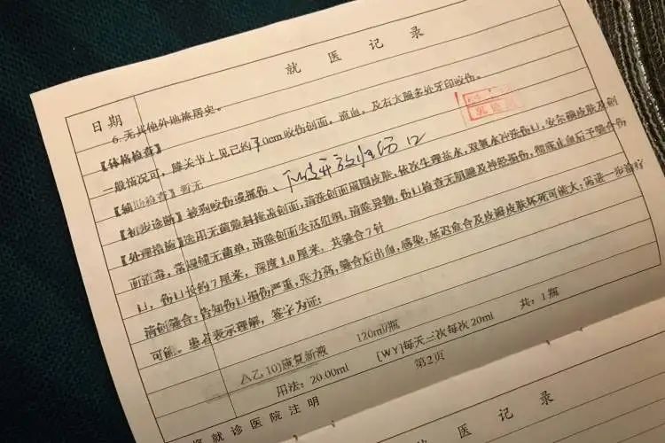陈女士的就医记录显示:“患者被狗咬伤,下肢开放性伤口长约7厘米、深度1厘米,共缝合7针……及在大腿多处咬伤,伤口损伤严重,张力高,缝合后出血、感染、延迟愈合及皮瓣皮肤坏死可能大。”