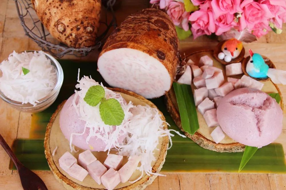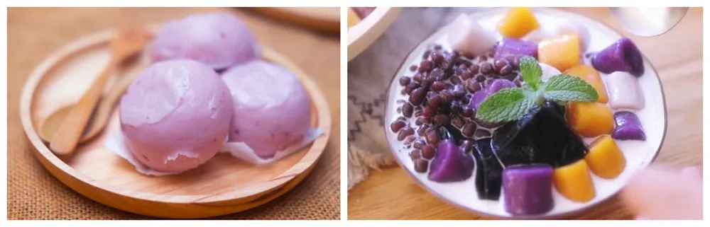 由于“香芋味”的颜色在人们脑海里形成了固有的印象,因此,有时制作以“真芋头“为原料的糕点时,人们也会习惯性加一些紫薯,调出参薯的色泽,如香芋派,还有芋头和木薯粉紫薯粉混合后,制成甜品里的“芋圆”。日语里人们经常把参薯和紫薯搞混,但无论怎么,大家心目中的“香芋味”,一定是泛着紫色的。