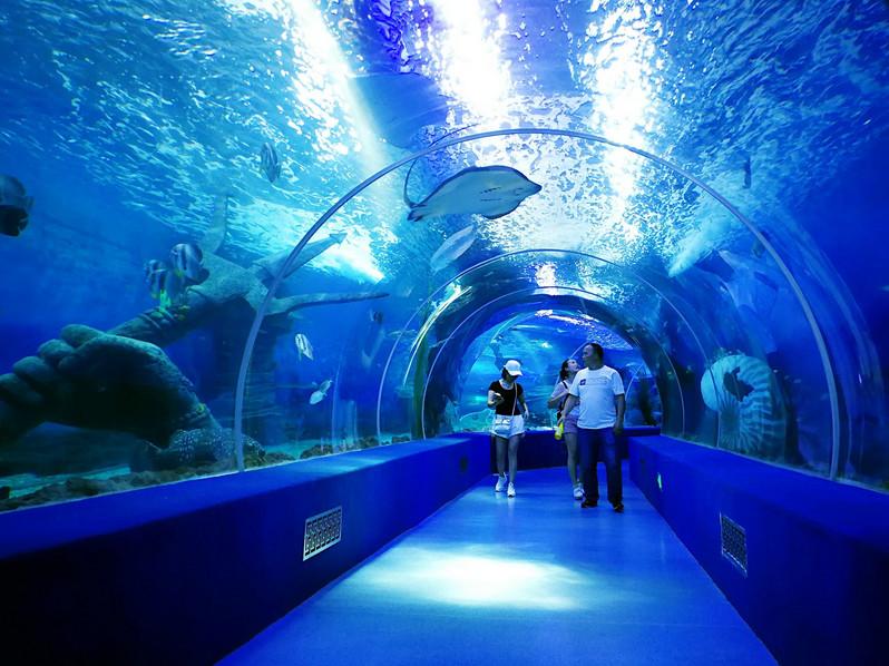 这里有东海鱼类展区、黄渤海鱼类展区、南海鱼类展区、台湾海峡鱼类展区、水下表演展区;给游客展示五大海区的海底奇观和鱼类品种。隧道规划设计与众不同,将海底岩层的洞穴景观与亚克力有机结合的大小变化的隧道,给人们带来一种海底的神秘感和奇观感。