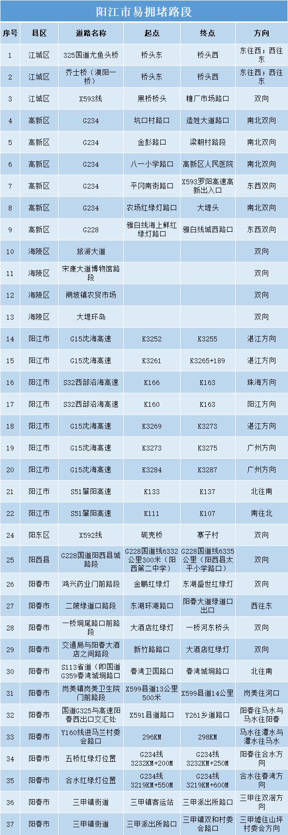 温馨提示:国庆、中秋期间,预计G15沈海高速阳江段车流量大,又因G15沈海高速阳江段改扩建施工,建议市民出行上高速之前要提前查看地图,定制路线,尽量避免拥堵路段。