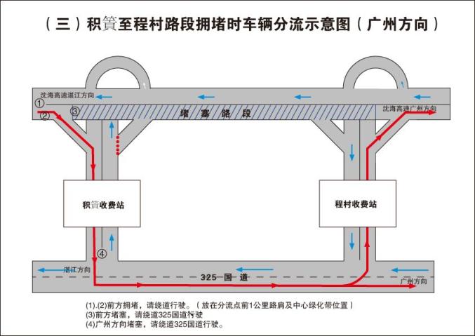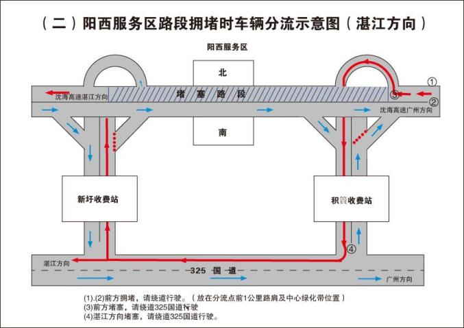 湛江至广州方向绕行路线为:阳茂高速→新圩出口→G325线沙扒路口→G325线→G325线塘口路口→阳西入口。