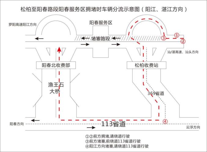 云浮往阳江、湛江方向绕行路线为:肇阳高速新庆立交互通→汕湛新阳高速公路松柏收费站→359国道→234国道→鱼王石大桥→肇阳高速公路阳春西收费站→阳江、湛江方向。