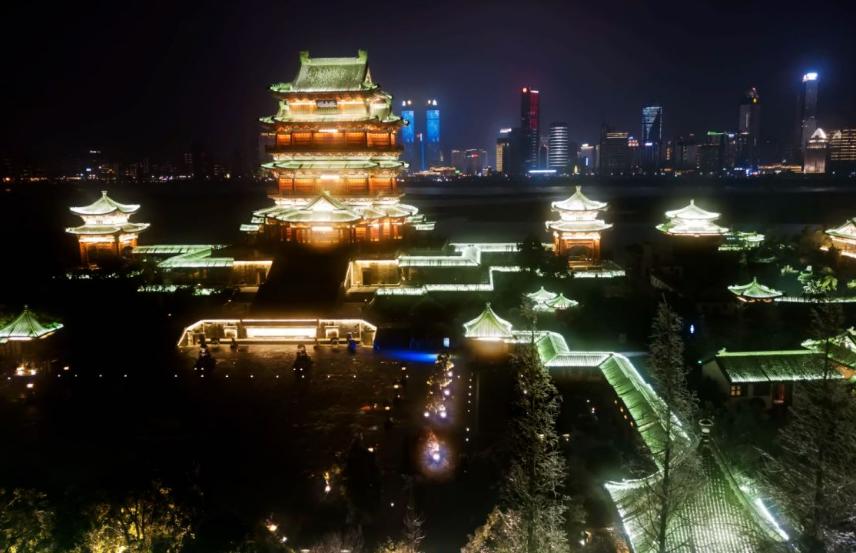 置身安源锦绣城,恍如时光流转,目光所及,层楼叠院,高脊飞檐,曲径回廊,亭台楼榭,文化与建筑艺术和谐交融,浑然天成。城内的徽派风格建筑,重现了老安源的街道、祠堂、茶楼、酒馆、宗教活动场所、民宅。明清风格的宫殿式建筑、千米回廊、观光塔等,让人仿佛穿越到了明清时期。