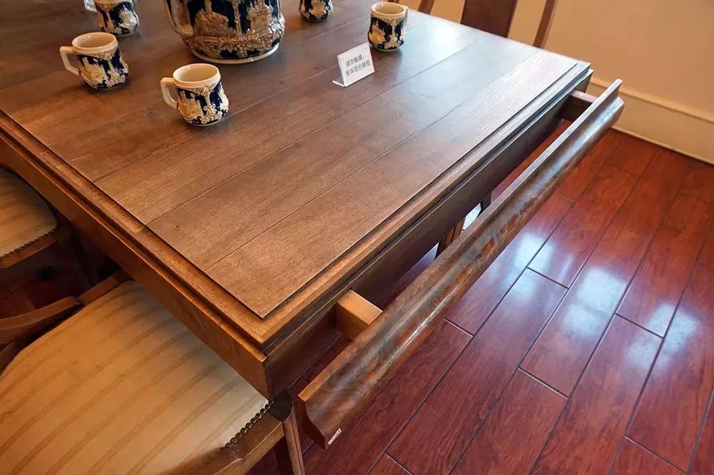 典型德式家具的餐桌餐椅,是用法国橡木制成的。人性化的两边突出部分可以抽出,在上面加垫挡板,便可以增长桌子的长度,以便主人招待宾客使用。