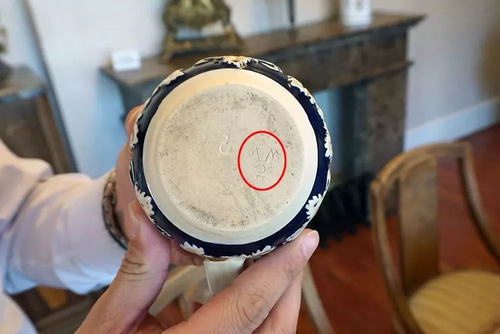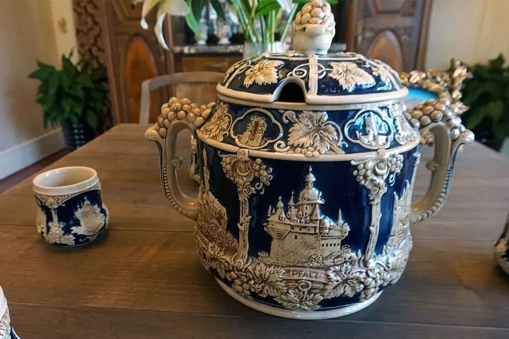 这套瓷器则来自当时德国的巴伐利亚,瓷器底部带有制作者的名款,立体浮雕的造型在制作中很难成型。瓷器身上的青蓝色,同中国青花瓷的颜料如出一辙。从东到西,从西又到东,瓷器之路走了个来回,成为了中西方文化交融的最好载体。