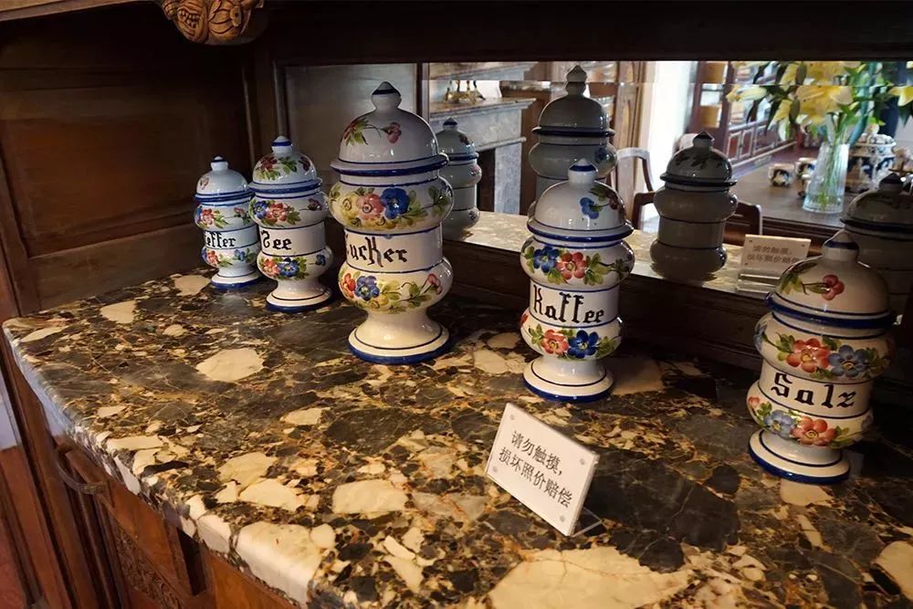 台上摆设的调料罐,是按照德国传统风俗习惯摆设的,中间最大的是糖,除了糖,其他调味品从左到右依次是:咖啡、茶、胡椒及盐。关于这个摆放顺序还有个小故事:起初,工作人员并不知道这些调料罐如何正确摆放,后来有一对德国夫妇来此旅游,大约是触景生情,这对夫妇便将正确的摆放方式告诉了工作人员。