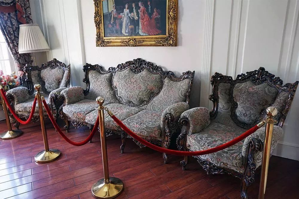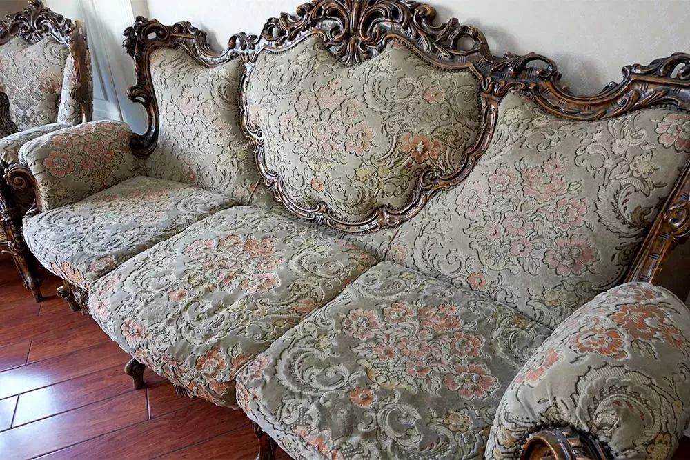 奥地利橡木制作而成的沙发,随着时间的变化,这种木头本身会形成一种类似金色的包浆,让整套沙发愈发散发出迷人的古典气息。沙发垫以天鹅绒为面,内里填装的是真正的海绵填充物。将近一个世纪,这套沙发依旧没有损坏且还保有弹性,使用起来依旧非常舒适。