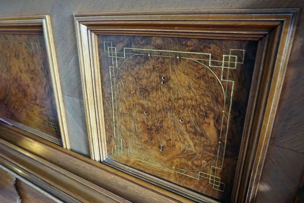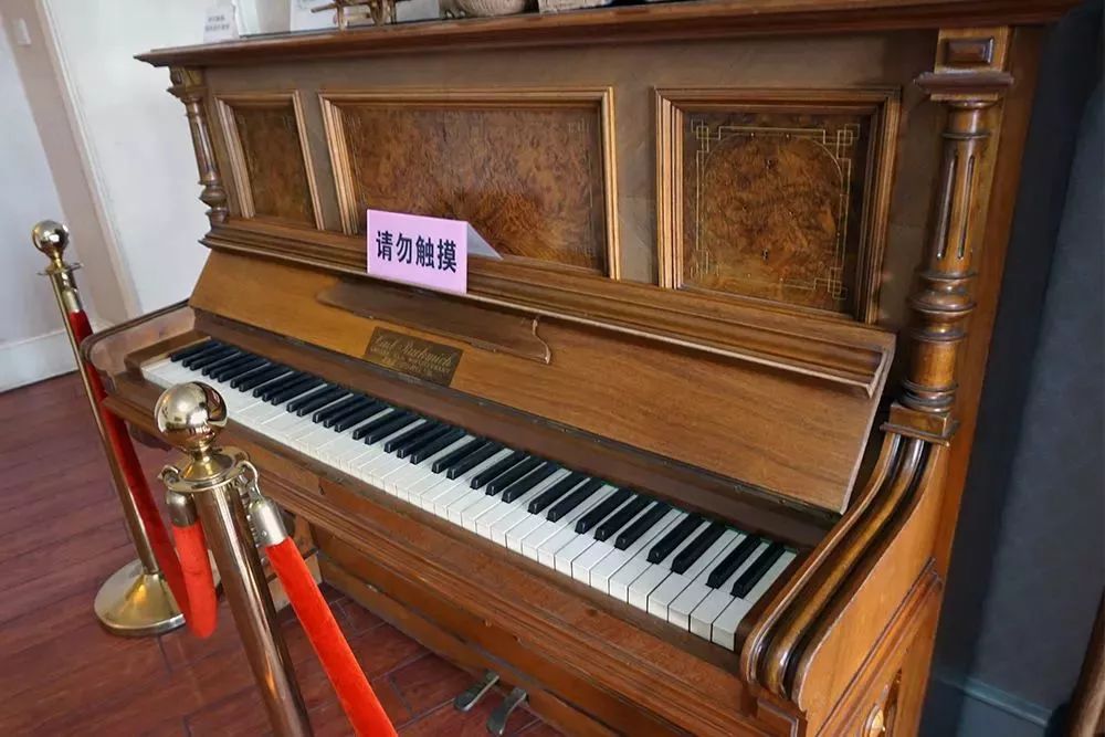 钢琴上原本还有一些徽章和铭文,但是因为年代的久远,这些物品早已剥落,只剩下一个个证明它们曾经存在的孔洞,诉说着一段沧桑的历史。