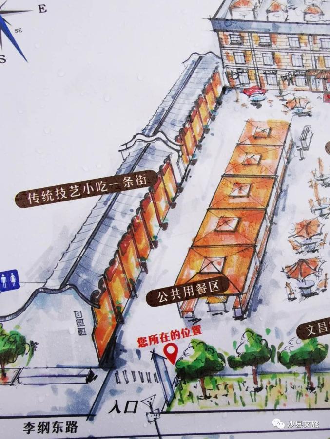 “传统技艺小吃一条街”位于沙县文昌街上,就在沙县李纲中路的尽头处,于文昌阁遥遥相望,相互辉映。