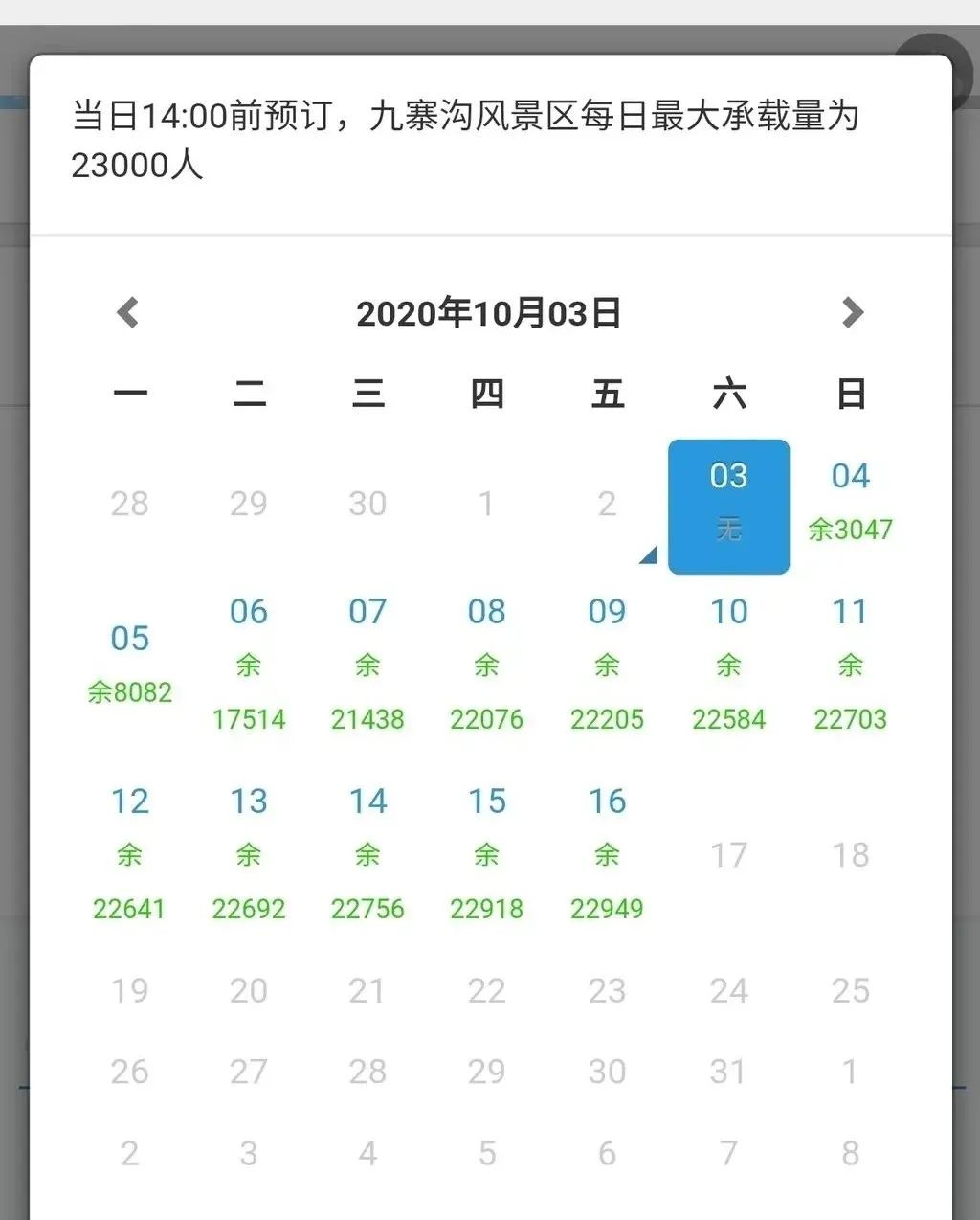 截至10月2日15点,据九寨沟景区门票预订官方平台显示:九寨沟景区10月3日门票已售罄。游客可预定剩余假日票;嫩恩桑措、爱情海等旅游景区还可预约预订。