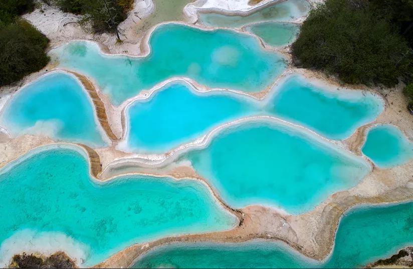 嫩恩桑措最特别之处在于它是目前世界上为数不多的,能同时看见高山湖泊和钙化彩池的景区。而且这两种地质形态呈交替层迭分布,在阳光的照射下,海子像锁进了虬枝的绿色宝石、钙化池像布满裙边的玉盏。两种美景互相映衬、互相纠结,像是一个水景交错的童话世界,又像是一个袖珍玲珑的世外仙境。