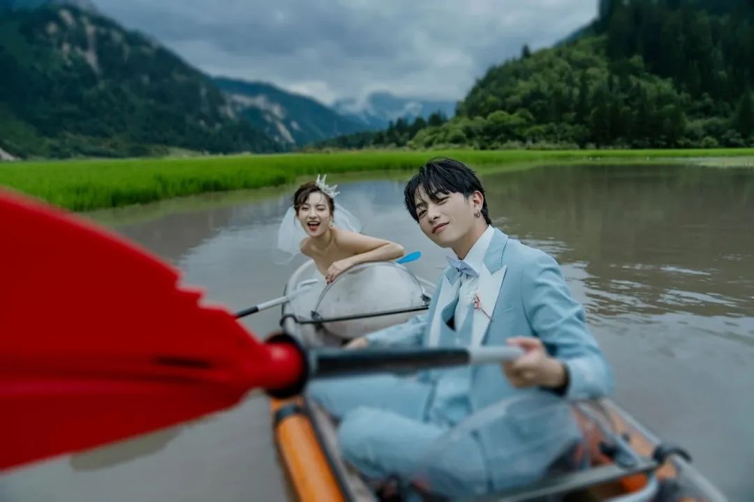 爱情海春夏秋冬景色各异,四周远山层叠,森林茂密,海子中溪水蜿蜒,芳草萋萋,如天鹅绒地毯铺满大地,夏秋季野花点缀其间,牛羊骡马成群,冬春时则一片深黄,与周围的雪山红叶相映成趣,仿佛一幅意境幽远的山水画面,因此甘海子也是全国10大婚纱外景拍摄地之一。