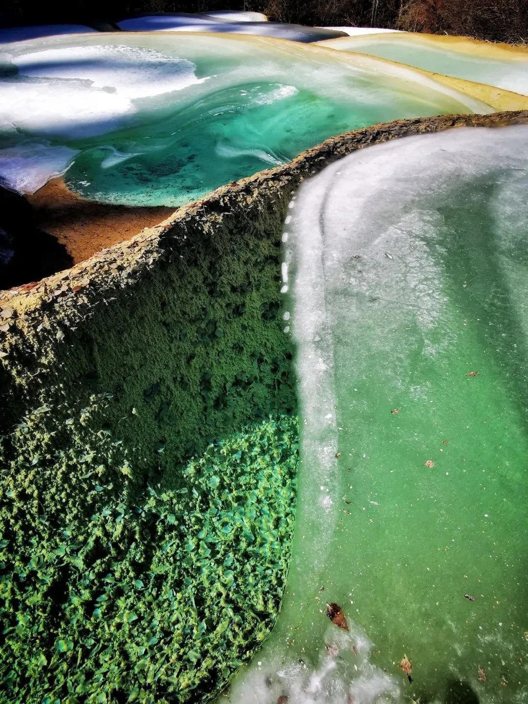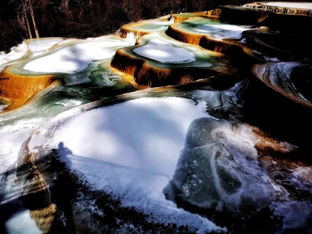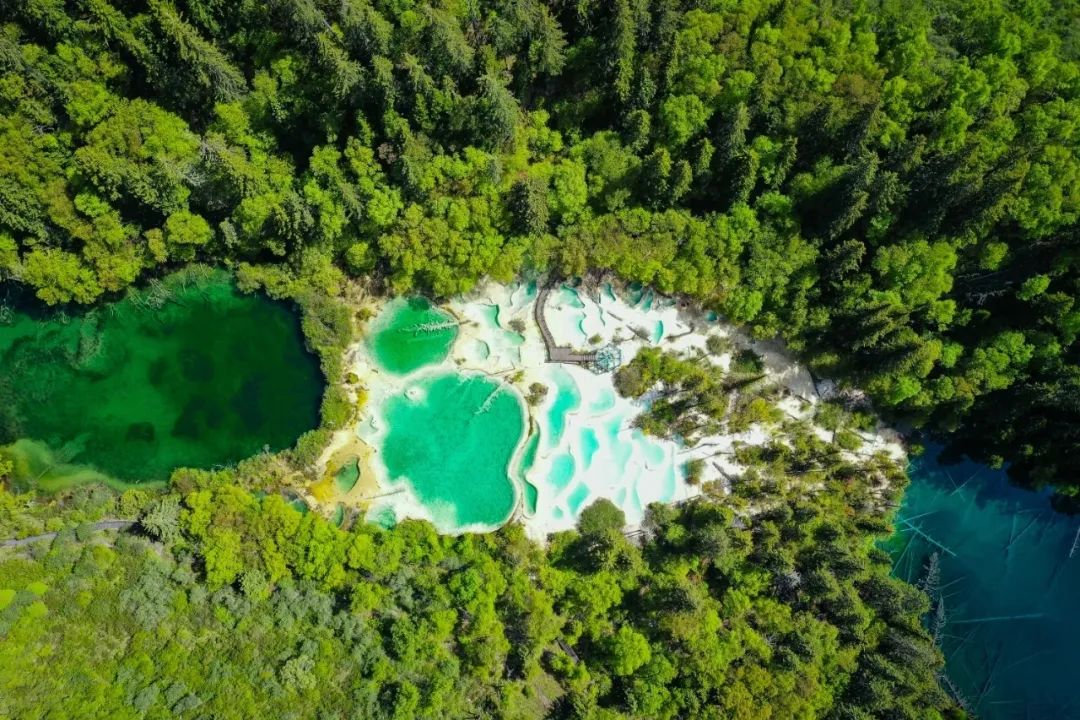 是国家森林公园,核心景区总面积为4.6万公顷,沟长大约5公里。由于这里的地貌侵蚀切割得特别剧烈,溪间的落差大,山地形成了1700个大小不等、水色明丽的彩池和湖泊,就是我们称的“海子”和“钙化台地”,是典型的地表喀斯特地貌,成片的山坡被黄色、乳白色钙质包裹,形成一个奇特的盆筑状钙化池和钙化坡。
