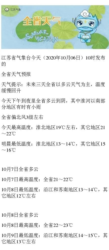 据@江苏气象报道,今天下午到夜里全省多云到阴,其中淮河以南部分地区有时有小雨,全省偏北风3级左右,今天最高温度:淮北地区19℃左右,其它地区21~22℃,明晨最低温度:淮北地区13~14℃,其它地区15~16℃。