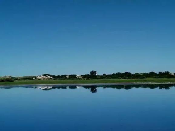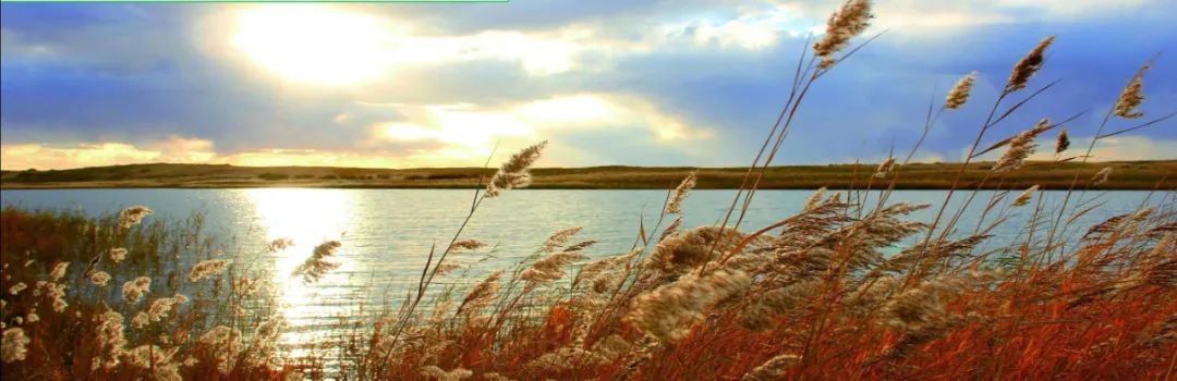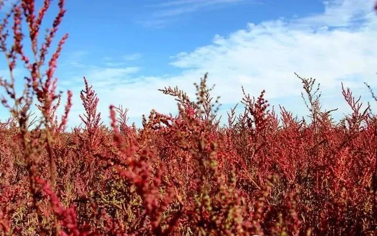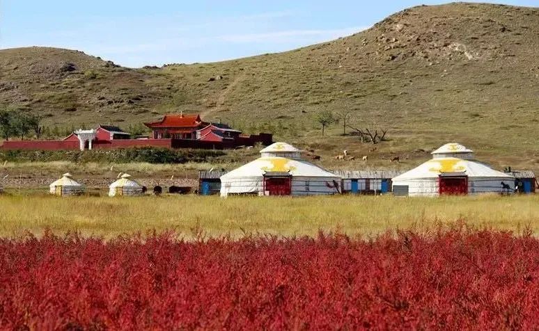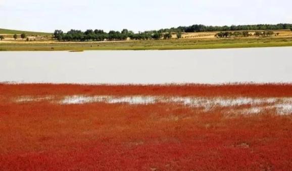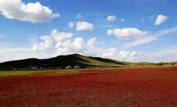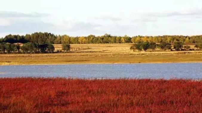 进入深秋,草原上的淖尔布满了红色的碱蓬草,四野望去,一片暗红。红色的草滩与周边金黄的杨树、绿黄的草原,在蓝天白云的映衬下如同一幅美丽的油画。