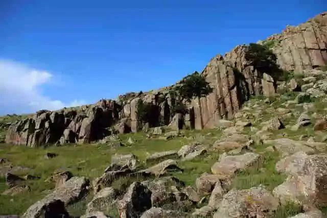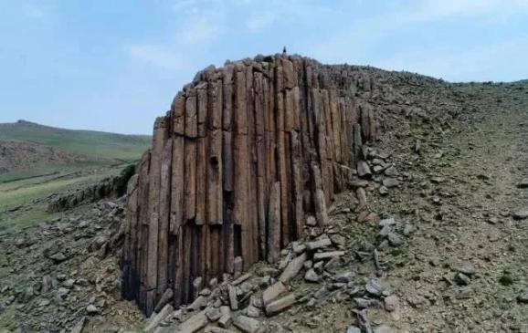 石条山主体呈石条状排列,是由火山喷发出的岩浆凝结成的玄武岩岩柱,是中国七大火山岩石柱群之一,也是草原上的火山遗迹——火山锥。道道石条像一本摊开成册的竹简,记录着厚重的历史;又像一个孤独伫立的老者,闭目思索着今与昔。由火山迸发张力飞落山涧的群石,仿佛也都通了灵性。一块石头,就有一个象形;一块石头,就是一个传说……
