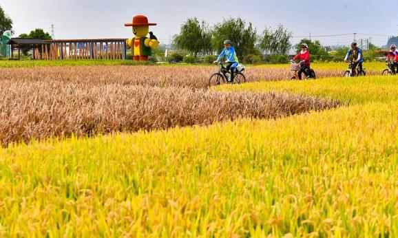 市民在江宁湖熟现代农业示范园区多彩的稻田间快乐骑行。南报融媒体记者 冯芃 摄