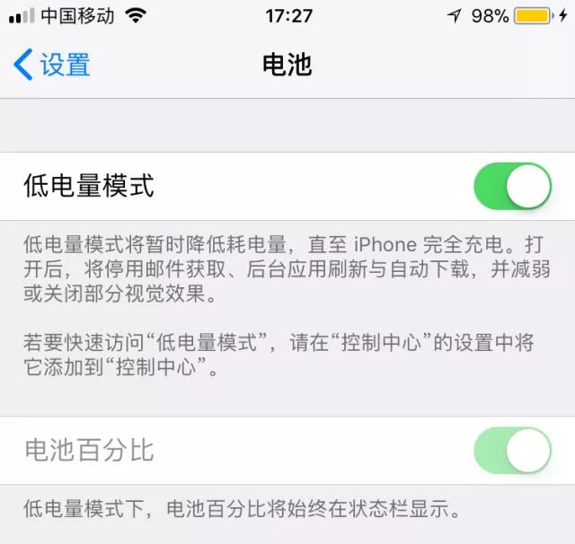 当电量低于20%时,手机会自动提示是否【开启低电量模式】,实际上,低电量模式任何时候都可以开。