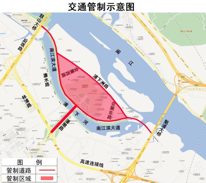 2020年10月11日7:00至18:00,2020年10月12日14:00至18:00,2020年10月13日至10月15日每日7:00至18:00,对浦下洲路、会展东路、会展西路实行交通管制,禁止车辆(除持专用通行证车辆、公交车、出租车外)通行,南江滨大道(东起魁浦大桥桥下西侧路段西至鼓山大桥下)禁止所有车辆(含公交车和出租车)停靠。