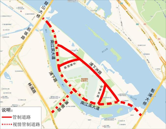 同时根据道路交通流量实际情况,视情对南江滨大道(东起魁浦大桥桥下西侧路段西至后坂路路口)、潘墩路(南起林浦路路口北至南江滨大道环岛路口)实行交通管制,禁止机动车(除持专用通行证车辆、公交车、出租车外)、非机动车进入海峡国际会展中心。