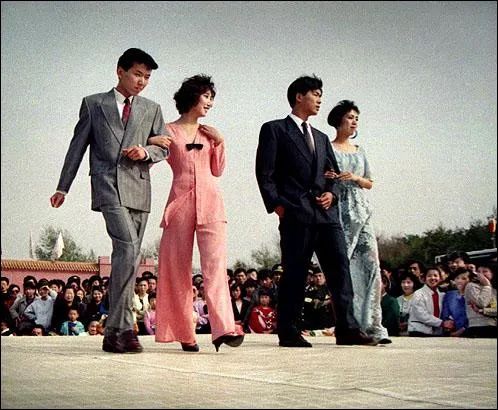 改革开放后,人们的爱美之心,开始在服装上得以释放。各式各样、五颜六色的服装涌入,令人眼花缭乱。花裙子、蝙蝠衫、喇叭裤、一步裙、西装、旗袍、风衣都纷纷出现。