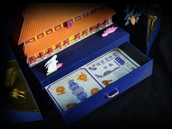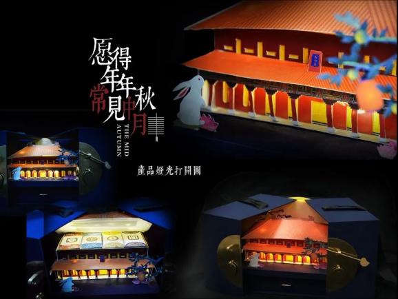 中秋佳节食俗月饼,有着“月满团睦”的好意喻,好的月饼包装更是在传统意义上如同锦上添花。出自视觉传达设计专业陈雨星同学的《愿得年年常见中秋月》月饼包装设计,以故宫太和殿为主体造型,打开金属铜饰便能看到圆月,金碧辉煌的殿宇,挂上灯笼的树木,玉兔和莲花,带给用户一种深入其境的体验感。