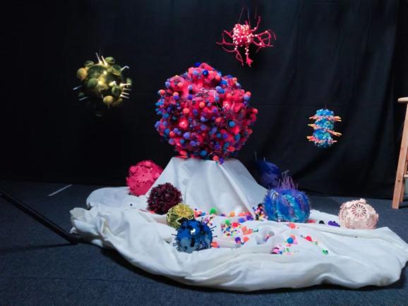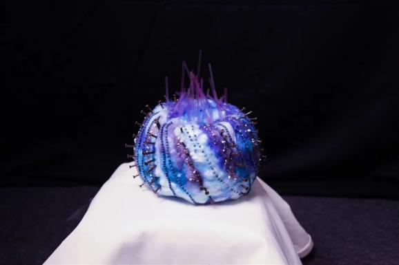 苏州大学文正学院艺术系产品设计专业学生沈心满认为,每一个主体物都是人们对某种气味不同的感官感受,“在制作过程中,也添加了我们心里各自的想法。这个作品名字叫氤氲,由蓝紫色构成,上面有钉子、珠子和网格布做成,作品给人一种烟雾缭绕的感觉。”