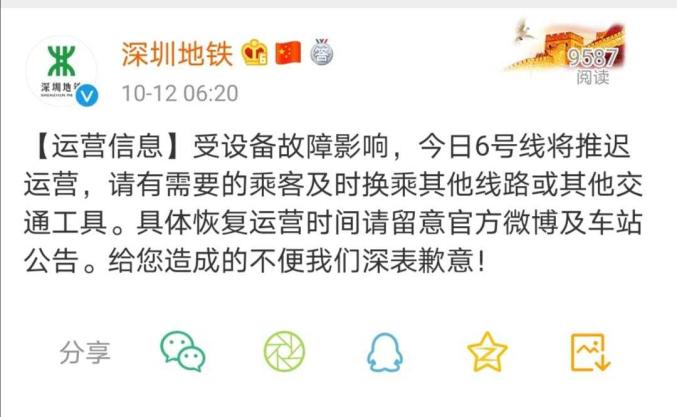 【运营信息】受设备故障影响,今日6号线将推迟运营,请有需要的乘客及时换乘其他线路或其他交通工具。具体恢复运营时间请留意官方微博及车站公告。