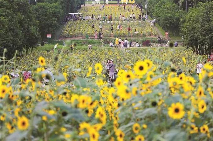 5、连日来,深圳市民中心南广场向日葵花海再次集中绽放。这片花田从最初的翻土、播种,到间苗、施肥、养护,全程都是由市民志愿者自行完成的。在志愿者的协作下,3300平方米的花田里共种植了4000余株向日葵。美丽花海吸引众多市民前来游玩,路过游人纷纷举起手机留影。