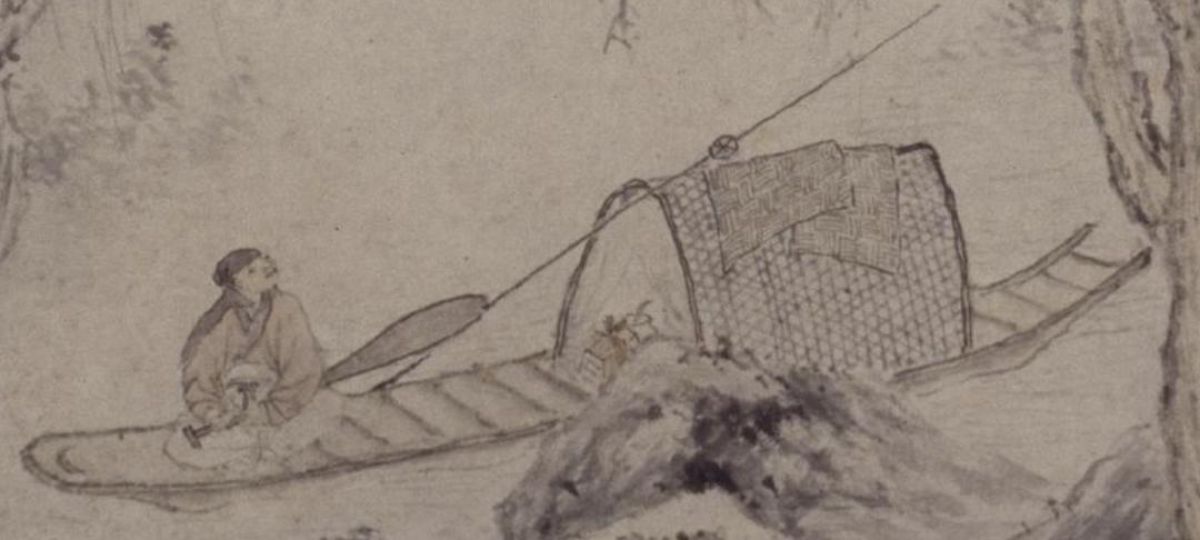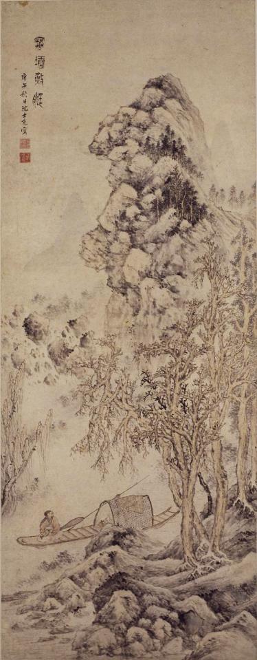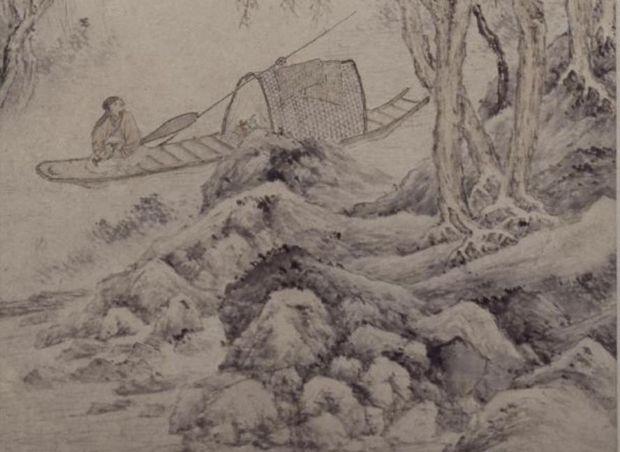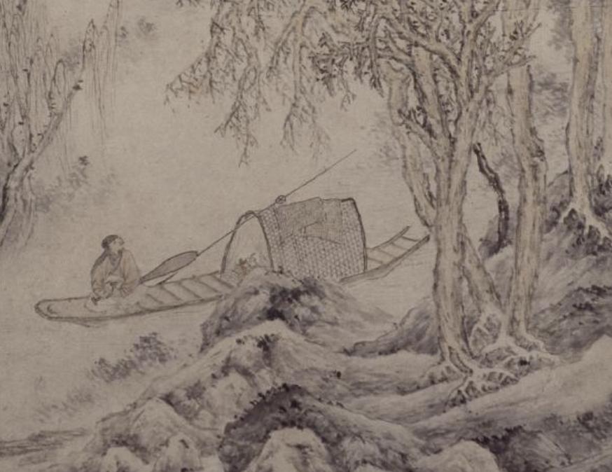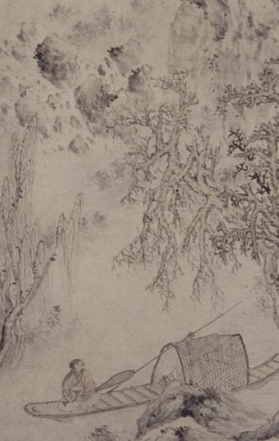 这幅《寒塘渔艇图》描绘了深山寒塘中一位文士独坐船头的场景。