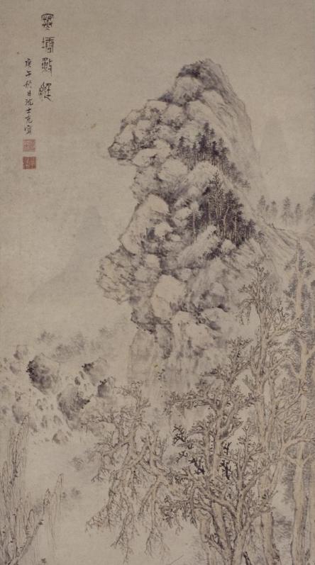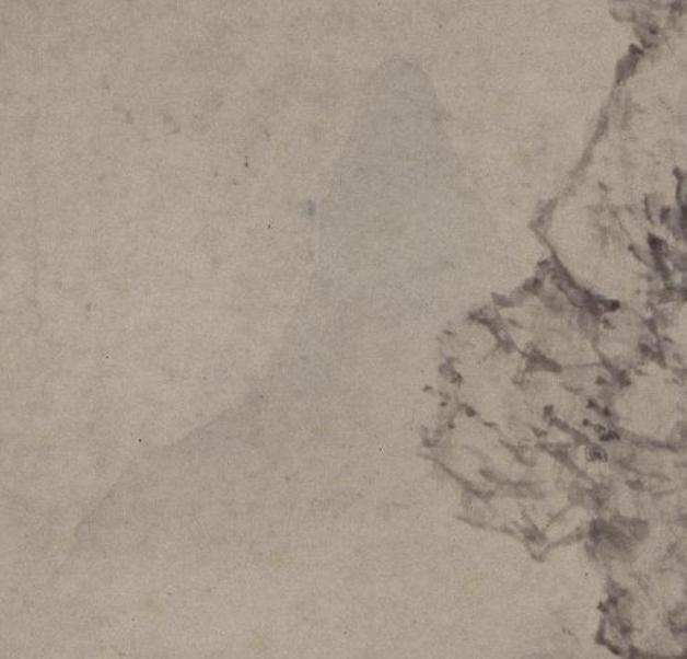 首先映入眼帘的,是画面上方占据很大面积的孤峰,山体宏大瞩目,巨石层叠,左侧陡峭,右侧山势稍缓。