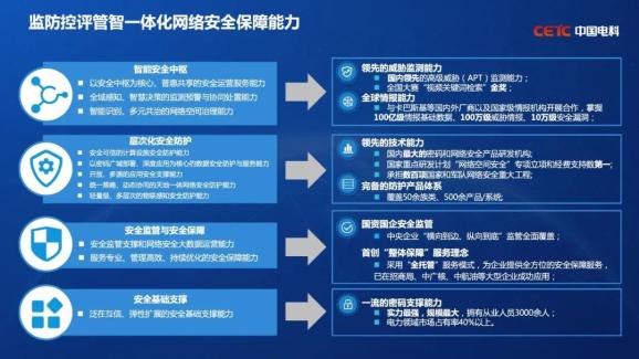 强健“身躯”——展示的“监防控评管智”一体化网络安全保障能力,好比地基的“混凝土”,以智能安全中枢、层次化安全防护、安全保障、安全基础支撑等四方面能力,维持安全体系的持续有效、自我演进。“智能安全中枢方面,我们拥有国内领先的高级威胁(APT)监测能力,获得全国大赛‘视频关键词检索’金奖,掌握100亿级情报基础数据、100万级威胁情报、10万级安全漏洞;层次化安全防护方面,我们承担数百项网络安全重大工程,拥有覆盖50余族类、500余产品/系统的完备防护产品体系;安全保障方面形成了‘横向到边、纵向到底’全托管监管服务模式;安全基础支撑方面拥有一流的密码支撑能力,实力最强,规模最大……”中国电科网络安全技术专家表示;