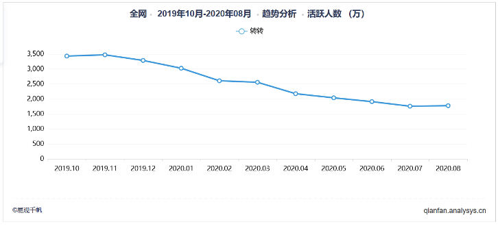 无论是长久的口碑积累还是专业垂直能力,采买模式都不是一个好选择,尤其是“精准深耕”趋势愈发明显的时候,这种模式下很容易丧失竞争力。根据易观千帆的数据,转转2019年10月~2020年8月活跃用户逐步走低,也从侧面验证这一情况。