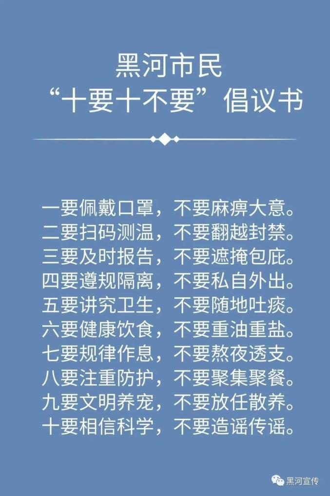 三、请市民如非必要,近期不要前往青岛市。如必须前往,请务必做好个人防护;从青岛市返黑后,要按照黑河市的相关防控措施执行。