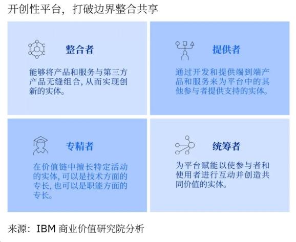 在2018年时,只有55%的中国受访企业参与到了平台模式中,而参与业务生态系统的企业则更少,仅占18%。IBM最新的调查则显示:当问及企业高管2022年的计划时,94%的中国高管希望积极参与平台模式,78%希望积极参与生态系统,这个数字比两年前多出3倍多。可以说,各行业都在积极参与平台经济,在其中扮演着平台整合者、提供者、专精者、统筹者中的一种或者多种角色。
