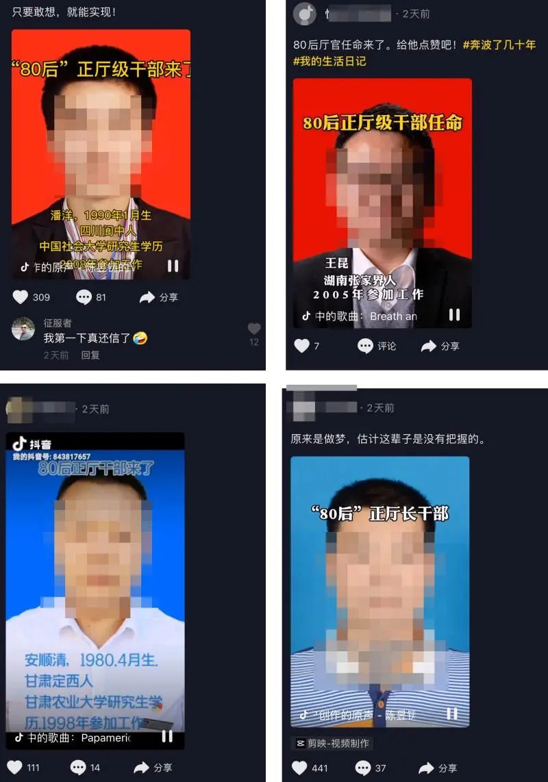 记者看到,这些截图都是截自于抖音短视频,截图均为个人肖像照加上级别、个人简历的组合,看起来颇具迷惑性。这些所谓的“80后副部”“90后正厅”是真的吗?