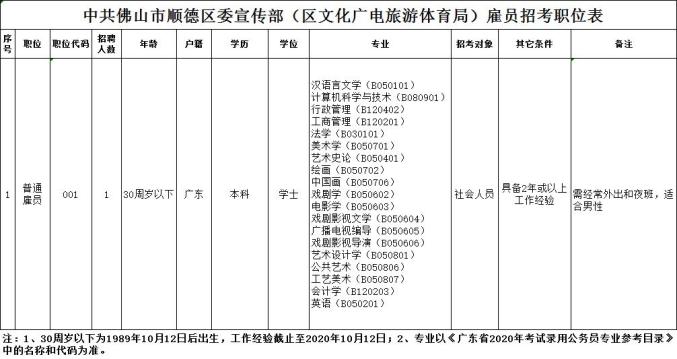 7.岗位所需的其他条件详见附件1《中共佛山市顺德区委宣传部(区文化广电旅游体育局)雇员招考职位表》。